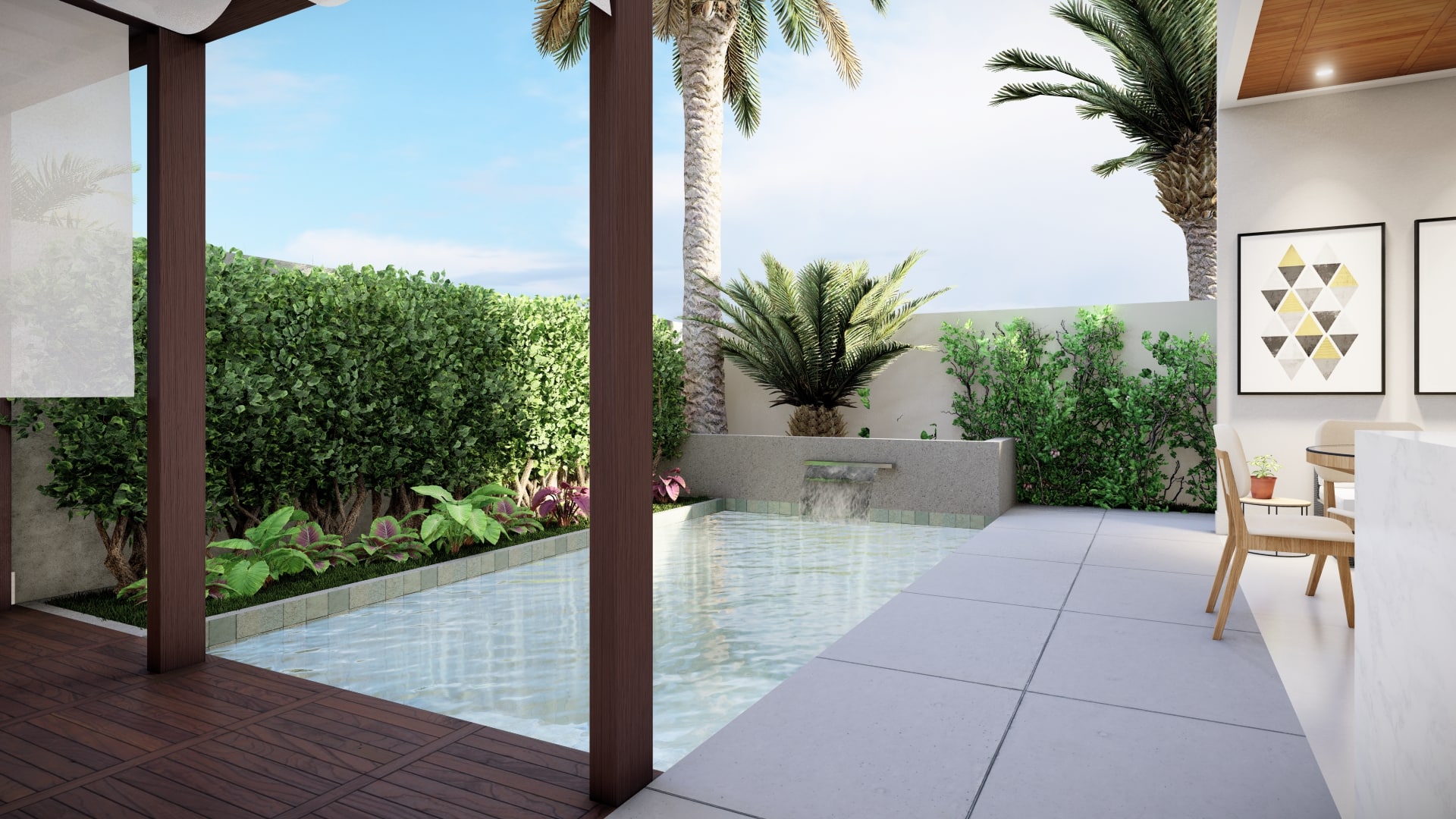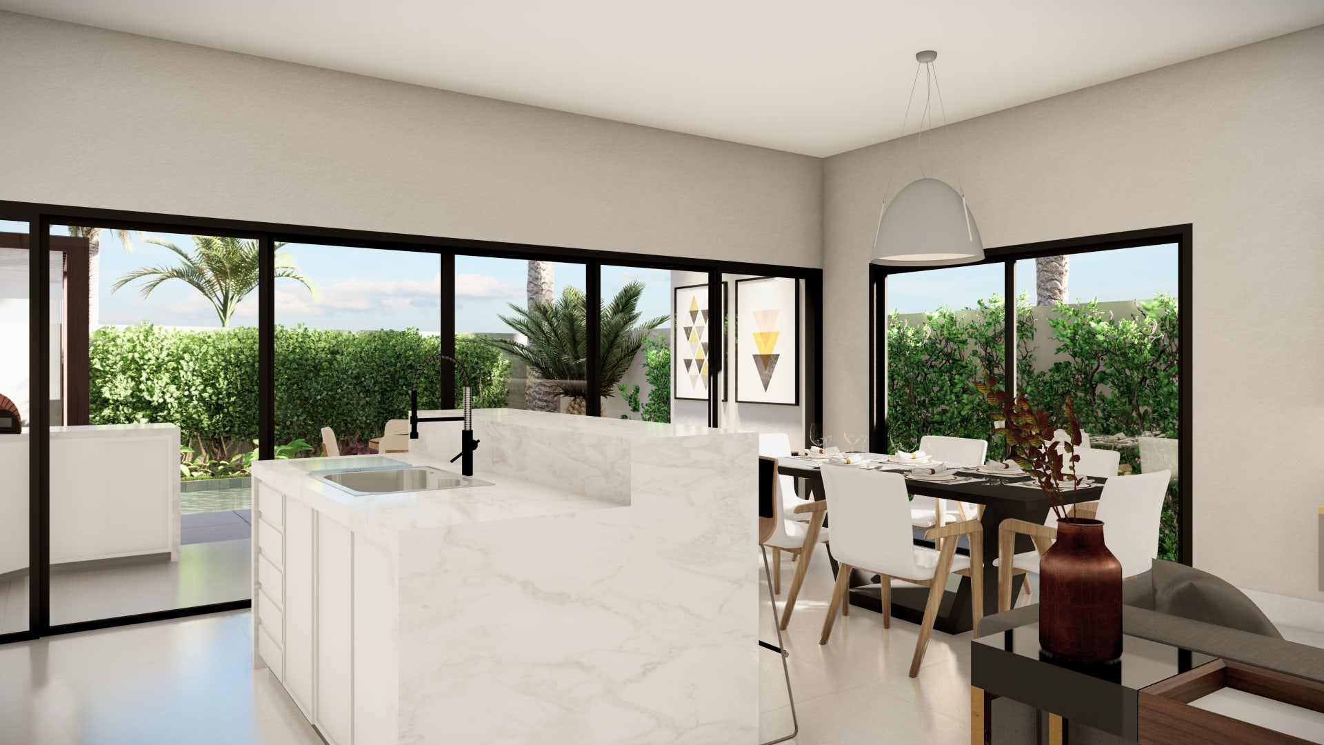 Buscando um melhor aproveitamento do terreno em aclive e das condições de ventilação e iluminação, a residência se desenvolve com a piscina e área de lazer aos fundos, podendo ser totalmente integrada ao conjunto social de cozinha e salas de estar e jantar do pavimento térreo através da esquadria que se abre completamente.