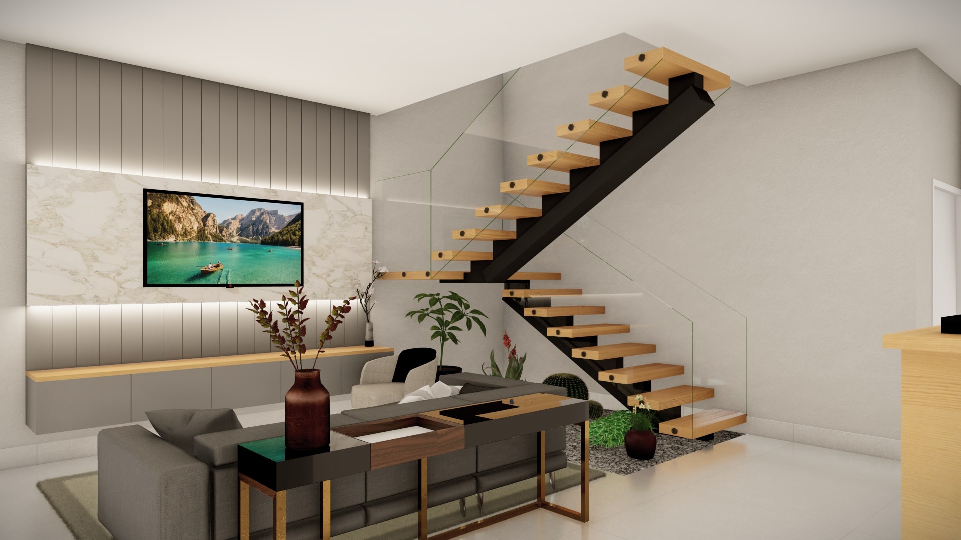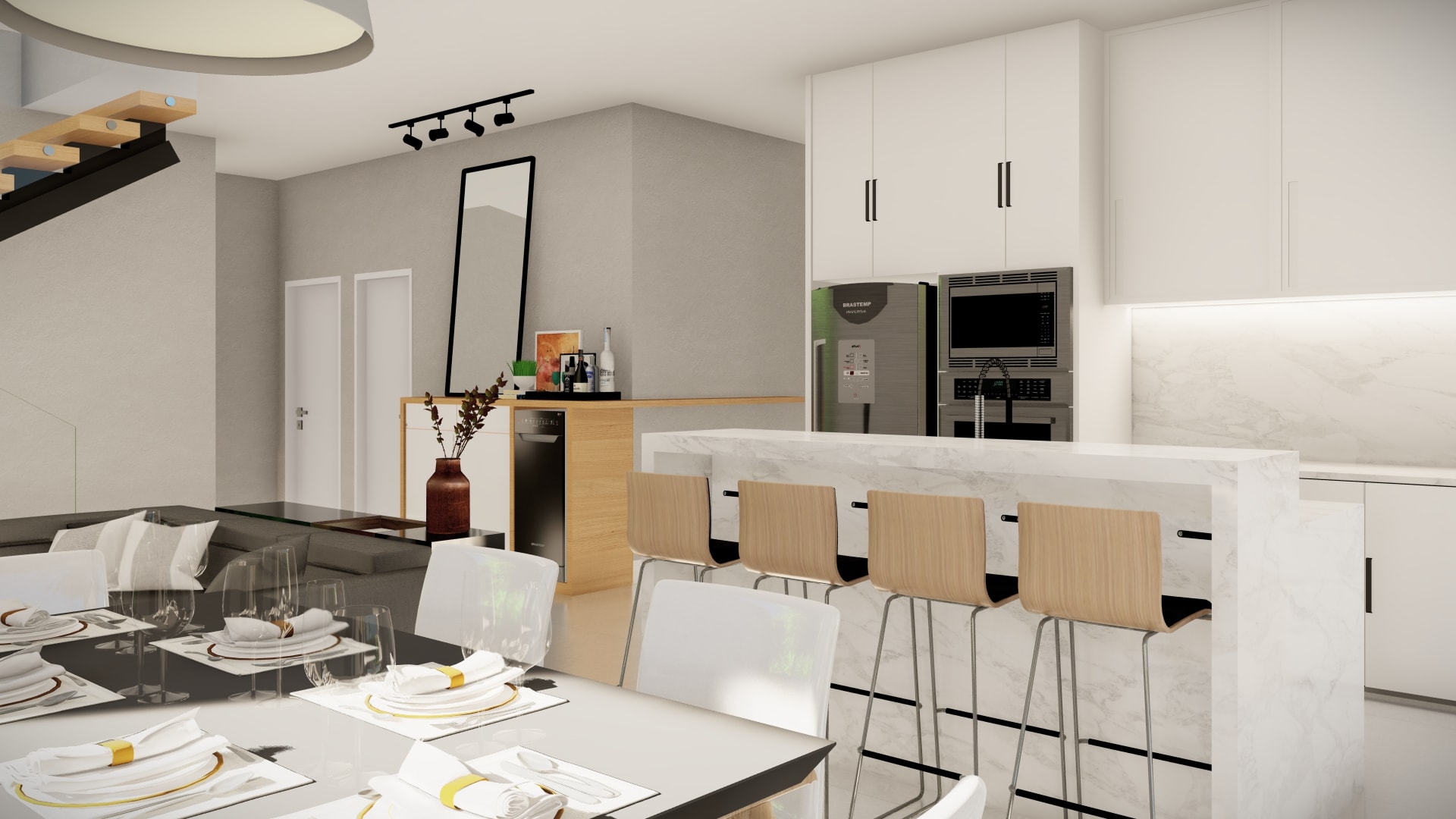 O térreo conta também com um escritório e banheiros que podem ser convertidos para uma terceira suíte no futuro. Uma escada em estrutura metálica que transmite a senação de leveza leva para o segundo pavimento onde o projeto abriga uma copa, duas suítes e duas grandes varandas.